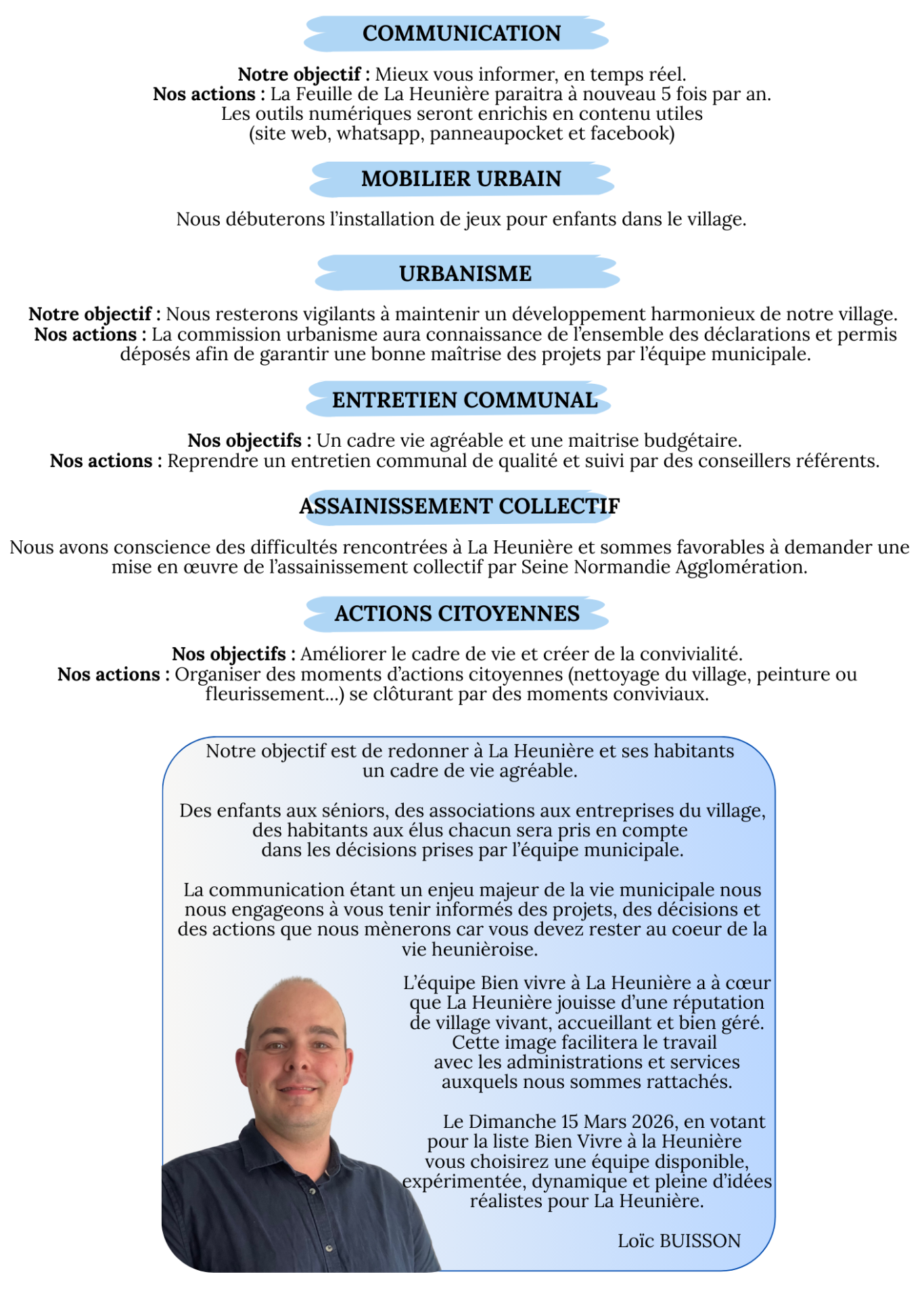 Améliorer le cadre de vie c'est à la fois se préoccuper de l'aspect esthétique que de l'ambiance dans le village. La Heunière doit retrouver son charme, son calme, un environnement agréable à vivre, propre et chaleureux. Même si les 6 années passées ne s'effaceront pas en quelques mois nous sommes certains que c'est à l'équipe municipale d'être le moteur d'un retour à la quiétude, à la bonne humeur et au cadre agréable.