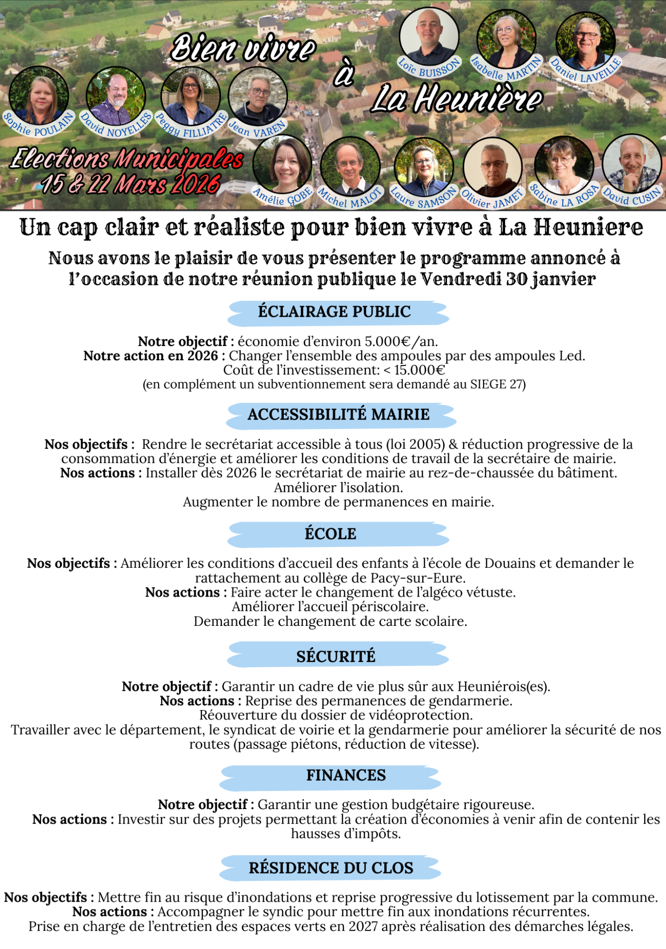 Lors de nos échanges avec les heuniéroises et heuniérois le sujet de la sécurité dans le village ne laisse pas indifférent. Dégradations, infractions routières, cambriolages, pollution, démarchage à domicile... ce sujet préoccupe. Et parce que l'équipe vit elle aussi dans notre village, elle vit elle aussi ces préoccupations. L'équipe à d'ores et déjà étudié des solutions sur ces sujets afin d'apporter les réponses adéquates.